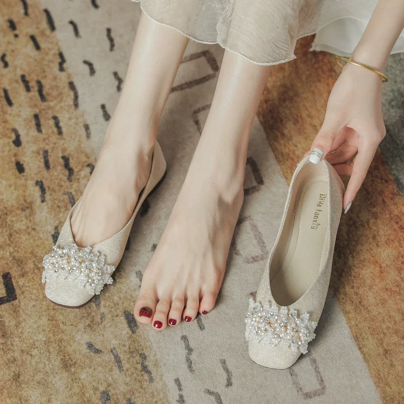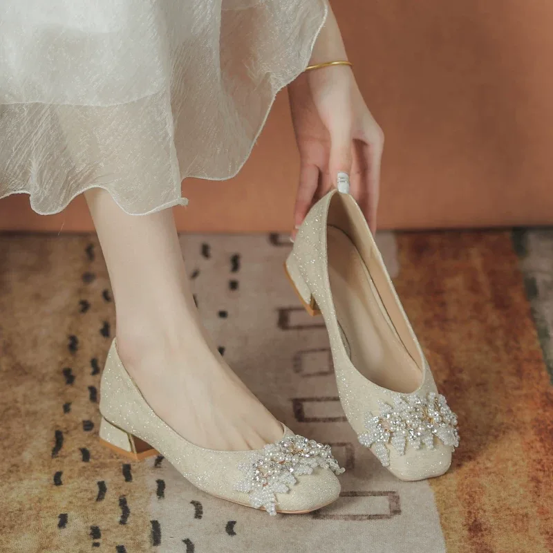 Bridal shoes code 2574, with their delicate and feminine design, are an ideal choice for brides. The shoe’s upper is made of high-quality leather, which not only offers softness and suppleness but also high durability and resistance. The simple and classic design of the shoe, featuring a square toe and a low heel, gives it a chic and modern appearance. The delicate handmade embellishments on the toe, including sparkling pearls and fine stones, add a feminine touch to it.