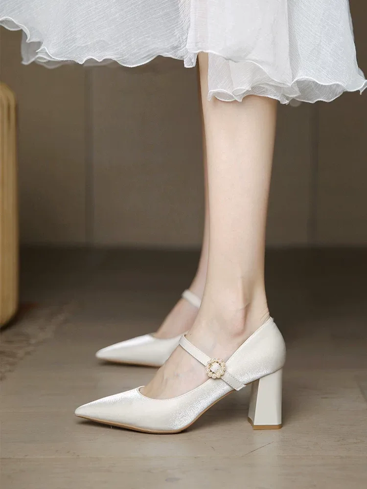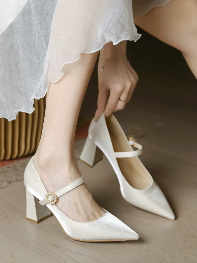 Bridal shoes, code 2576, with a classic yet modern design, are an ideal choice for the wedding day. The shiny and soft satin material of the shoe’s upper gives it a luxurious and feminine appearance, while the natural leather lining ensures comfort and durability. The high and slender heel of the shoe provides an elongated and attractive look to the legs, while also offering suitable stability and balance. The pointed toe adds a special elegance and beauty to its design. The delicate satin bow at the front of the shoe serves as a decorative element, giving it a romantic and charming touch.