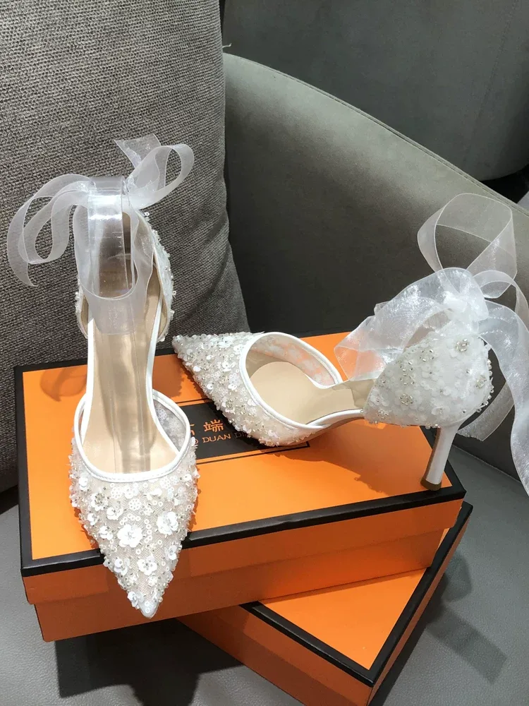 Bridal shoes code 2579, with their delicate and elegant design, are an ideal choice for special occasions and weddings. The upper part of the shoe is made from fine, transparent mesh fabric, adorned with sparkling sequins and delicate pearls, giving it a luxurious and feminine appearance. The back of the heel is enhanced with an organza bow, adding a romantic and charming touch. The interior lining is made of natural leather, ensuring comfort and preventing foot fatigue. These shoes, with their delightful appearance, will add a unique flair to the bride’s style.