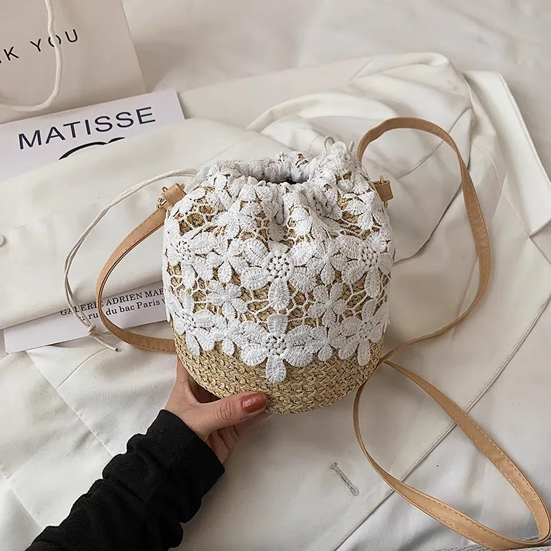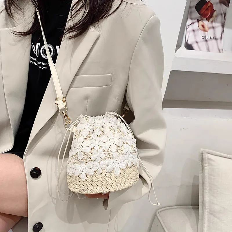 The woven shoulder bag with a floral design, code 2589, is part of the attractive and stylish collection of woven bags available on the Dimaj website. Its charming and whimsical shape makes it very popular among women. The round appearance and floral pattern on the bag elevate it from mere simplicity, making it suitable for both formal events and friendly gatherings. Woven bags have a high styling versatility, allowing them to be easily paired with oversized clothing and boho styles, as well as with minimalist, monochrome outfits, and even everyday wear. The woven bag is an excellent choice for women who prefer a casual style or are looking for lightness and comfort, while also seeking beauty and allure.
