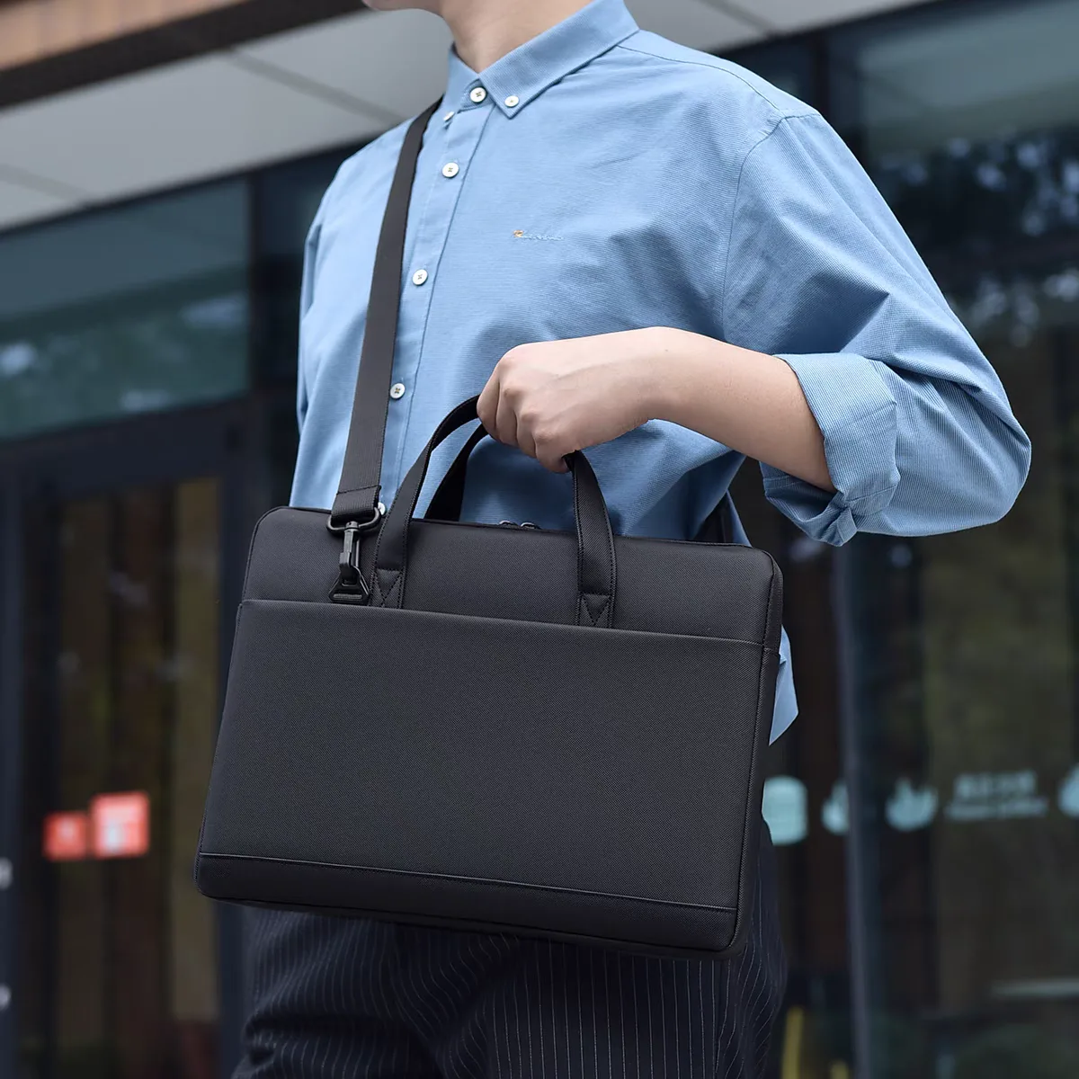 The men’s laptop bag, code 3126, with its minimalist and modern design, is a perfect choice for those who value style and quality. Made from high-quality synthetic leather, it has a luxurious and formal appearance suitable for work environments and professional meetings. The inner layer is made of soft polyester, protecting your laptop from impacts and scratches. Its ultra-slim and lightweight design makes it easy to carry without taking up extra space. It features practical pockets for storing documents, a mouse, a charger, and other accessories. Durable handles and a comfortable shoulder strap make it easy to carry the bag in any situation. An ideal choice for those looking for a combination of style, durability, and high performance in a laptop bag.