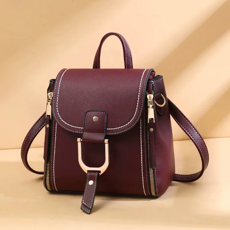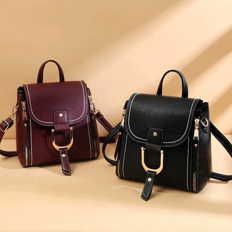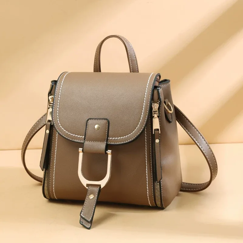 The women’s backpack, code 2361, with its chic and minimal design, is made of high-quality synthetic leather. Two large zippers are located on either side of the backpack, providing easy access to the items inside. The adjustable straps of this backpack allow it to be used as either a handbag or a backpack. Additionally, the gold-colored metal details used in the buckles and zippers give this backpack a luxurious and attractive appearance. Clean and orderly stitching and the use of high-quality leather are prominent features of this backpack, ensuring its high durability and longevity.