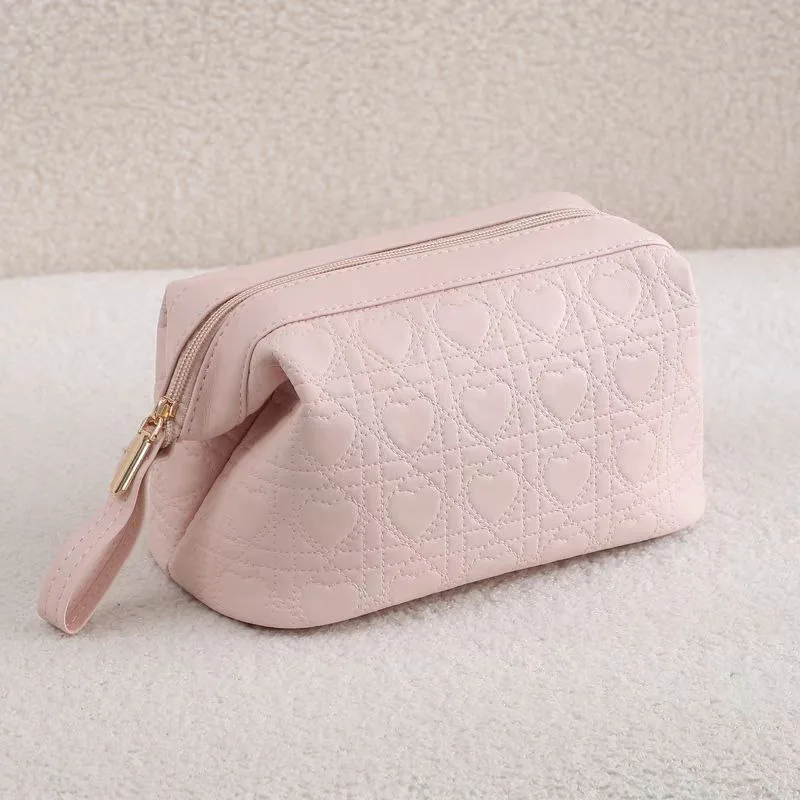 The women’s cosmetic bag, code 2897, with its heart-shaped design, is one of the most attractive and stylish products among cosmetic bags. This practical bag is an ideal choice for individuals who value organizing their daily cosmetics. Made from PU material, it not only has a chic and modern appearance but is also resistant to water and moisture. The interior of the bag is designed with a polyester lining that is easy to clean and highly durable. This bag features a golden zipper and a wrist strap, making it easy to carry.