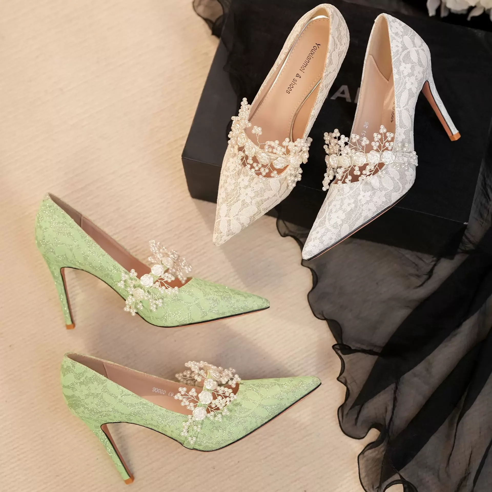 Women’s formal shoes, model 3113, feature an upper made from a combination of soft and textured lace, adorned with embossed floral patterns that lend a romantic and dreamy feel. The hand-sewn decorations on the toe area, including sparkling pearls and small flowers, create a luxurious and eye-catching appearance. The interior is made from high-quality synthetic leather, providing exceptional softness and comfort for the feet. With its unique design and delicate details, this shoe is an ideal choice for standing out at special events and weddings.