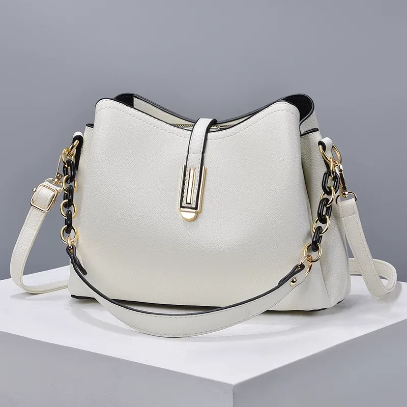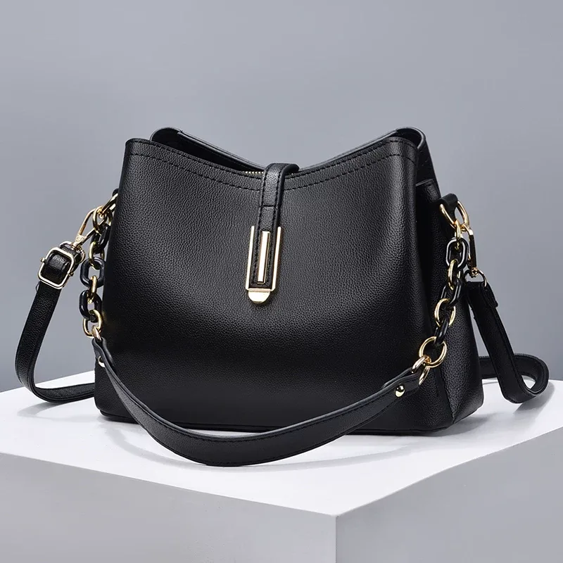 This bag is made from high-quality leather, giving it a classic and sophisticated appearance. It features a spacious interior, suitable for carrying all your essentials. Additionally, it has a comfortable shoulder strap that makes it easy to carry throughout the day. The bag is highlighted with gold hardware, including zippers and strap connectors. The stitching is consistent and well-executed, indicating durability and longevity. Overall, this bag is an excellent choice for anyone looking for a stylish and practical shoulder bag.