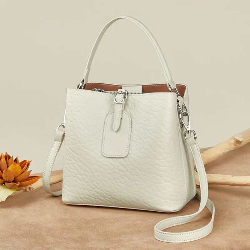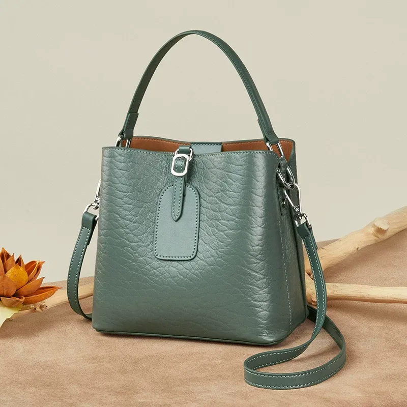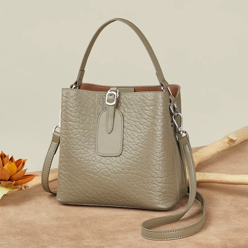 Women’s Handbag and Shoulder Bag Code 2380 is a spacious and stylish bucket bag suitable for everyday use and various occasions. The bag is made from high-quality leather with a delicate and natural texture that adds a special beauty to it. The design of the bag is simple yet elegant and can easily be matched with different styles. The bag’s straps are made of leather and match the color of the bag, with adjustable features allowing it to be used as a handbag or shoulder bag. On the front of the bag, there is a vertical leather piece that acts as a flap and is secured with a silver buckle. This piece not only adds to the bag’s beauty but also ensures its security.