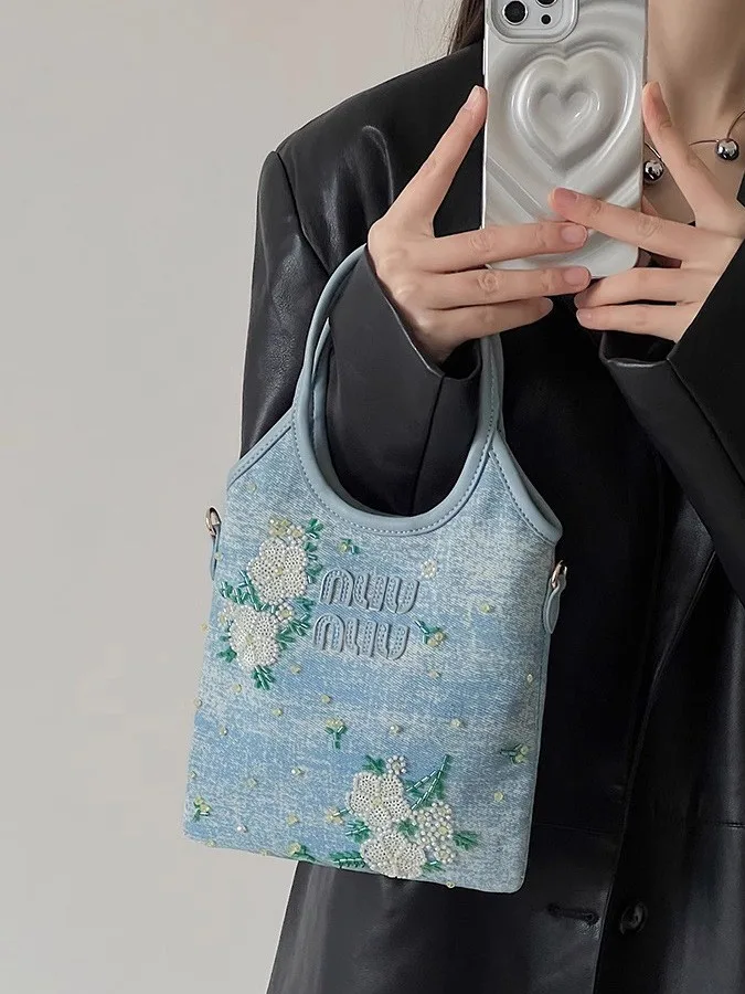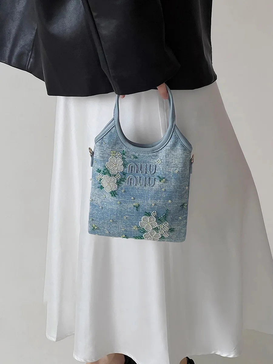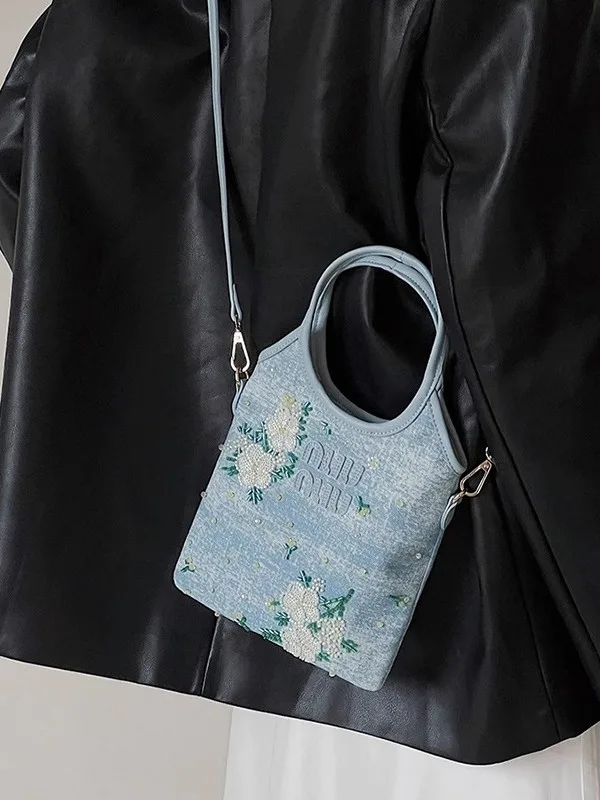 Women’s handbag and shoulder bag, code 3443, with an embroidered design, showcases a blend of art and functionality. The body and lining of this bag are made from high-quality denim fabric, which provides both high durability and a chic, distinctive appearance. The delicate embroidery on the bag adds a sense of creativity and beauty to everyday style. In addition to its visual appeal, this bag offers ample space for everyday items and is an excellent choice for use at university, shopping, or friendly gatherings.