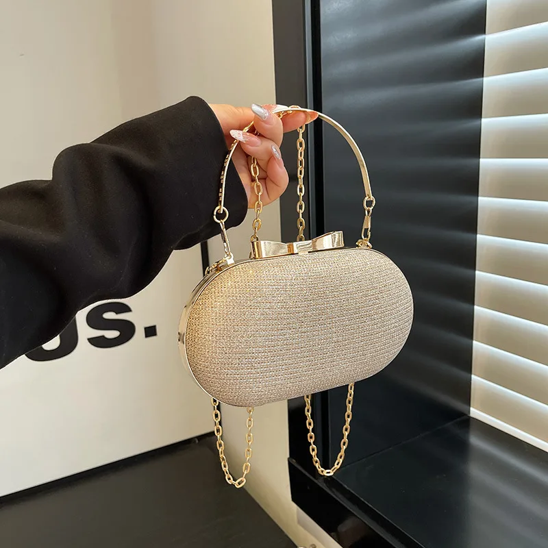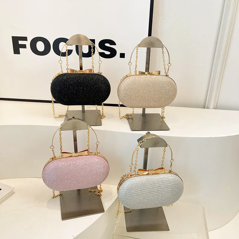 The women’s clutch evening bag, code 3449, with its oval design, offers a combination of beauty and functionality. It features a detachable shoulder strap, making it easy to use both as a handheld and shoulder bag. Its high-quality material and neat stitching make it a stylish option for parties and gatherings. The bag’s flap opens and closes with a delicate and unique magnetic bow, adding a feminine and chic touch. Additionally, its suitable dimensions provide enough space for essential items such as a mobile phone, cards, and small cosmetics.