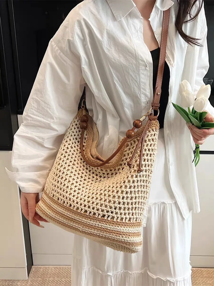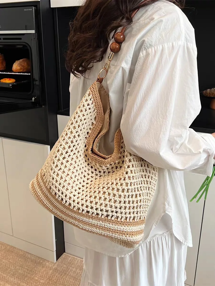 The women’s knitted bag, code 3137, with its unique design and minimal style, is an ideal choice for those seeking a chic yet comfortable look. Its open-knit pattern gives the bag a natural and attractive appearance, evoking a boho and rustic feel. Its soft and harmonious colors easily blend with summer and beach styles. The sturdy handles and tote design make it convenient for everyday use while adding a modern and distinctive touch to your style. This bag is not only suitable for urban use but also makes an excellent choice for travel, shopping, or picnics. By pairing it with linen clothing, loose coats, and woven sandals, you can achieve a stylish and eye-catching look.