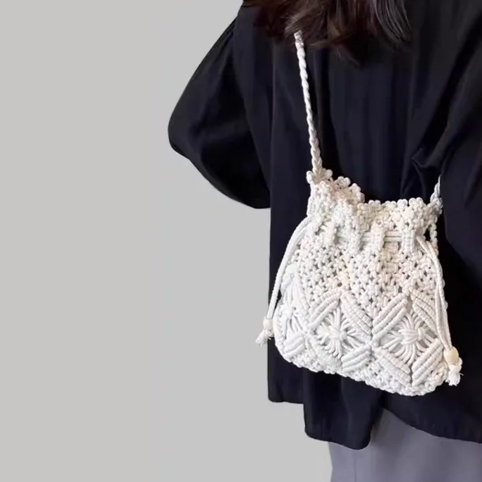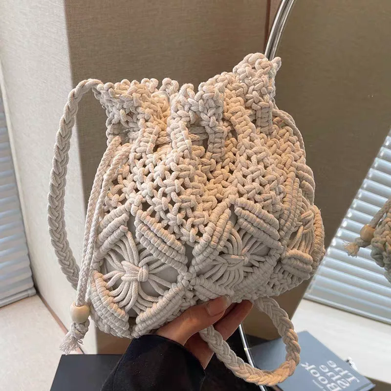 The women’s knitted bag, code 3151, is made from macramé and features a unique and special design. This bag has both coarse and delicate weaves, giving it a voluminous and beautiful appearance. The handles of the bag are also made from macramé and are designed as thick ropes, secured with two wooden knots at their ends. The bag is medium-sized and seems suitable for everyday use, beach outings, and informal gatherings. Please note that due to the macramé material, it is advisable to avoid placing heavy and sharp objects inside the bag.