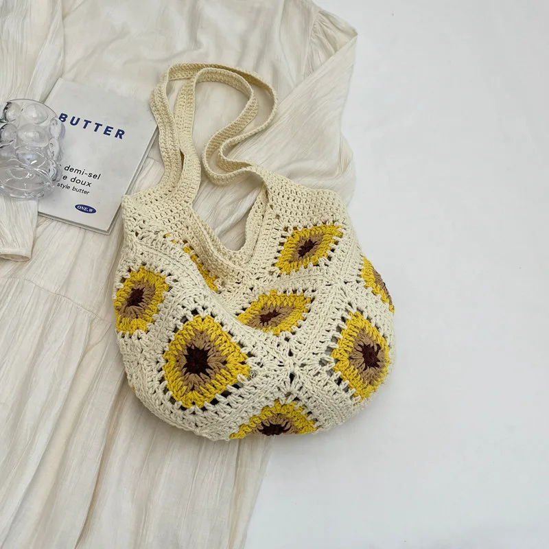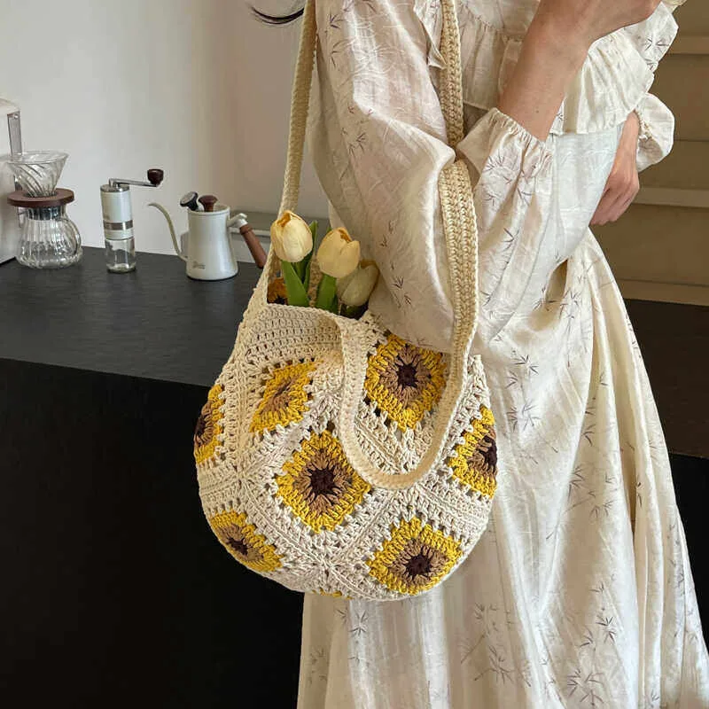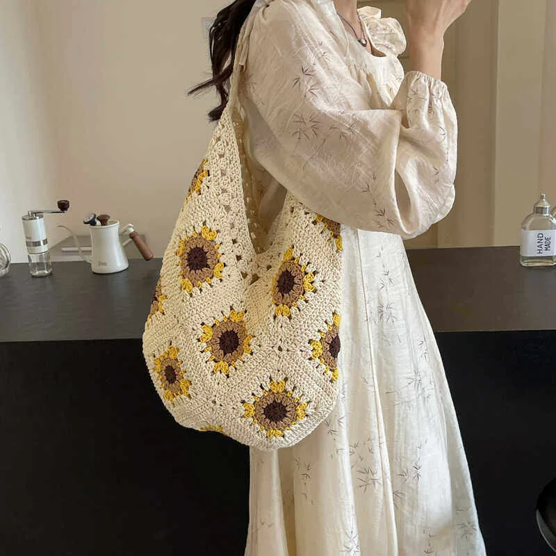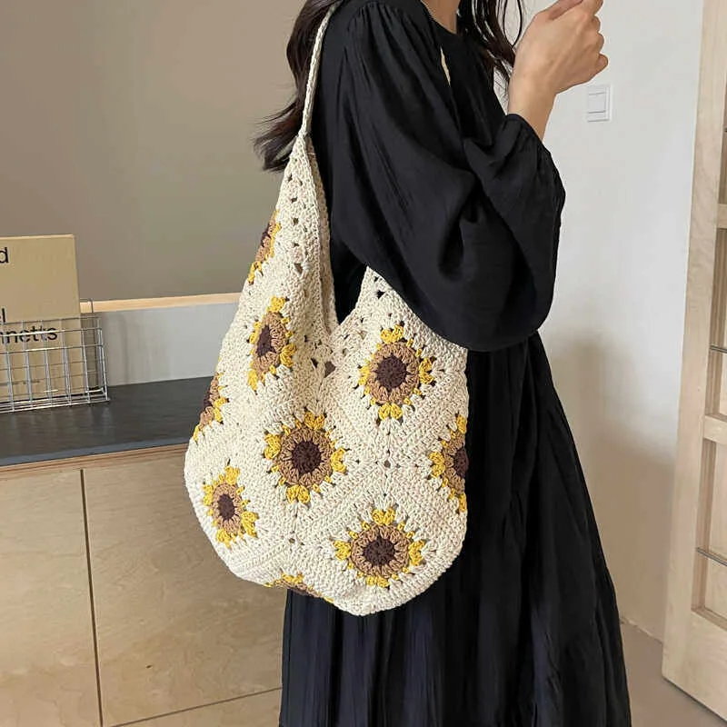 The women’s knitted bag, code 3170, is a large and soft bag crocheted from cream-colored cotton yarn, featuring large sunflower designs in brown and yellow throughout. The bag has a wide, integrated shoulder strap made of the same cotton material, which comfortably rests on the shoulder. The weave of the bag is relatively open and mesh-like, making it suitable for use in warm seasons. The overall appearance of this bag suggests it is a handmade accessory with an artistic vibe, suitable for use as a shopping bag or an everyday bag.