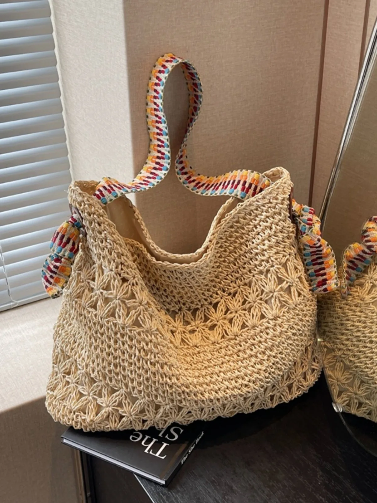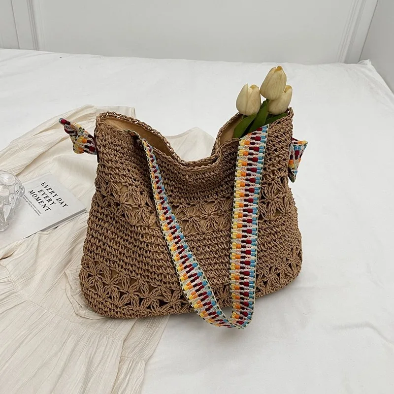 The women’s knitted shoulder bag, code 3165, is a large and spacious handbag made from woven jute fibers. It features a coarse and breathable weave, making it suitable for use during the warmer seasons. The handles are made of fabric with a colorful striped pattern, including shades of blue, red, orange, and brown. These handles loop through both sides of the bag and are attached to the bag’s body with decorative knots. The interior of the bag appears to be bright and made of polyester. With its natural appearance and colorful decorations, this bag can be a stylish and practical choice for everyday use or travel.