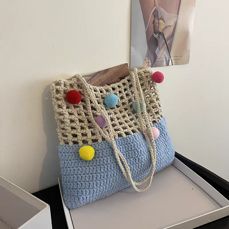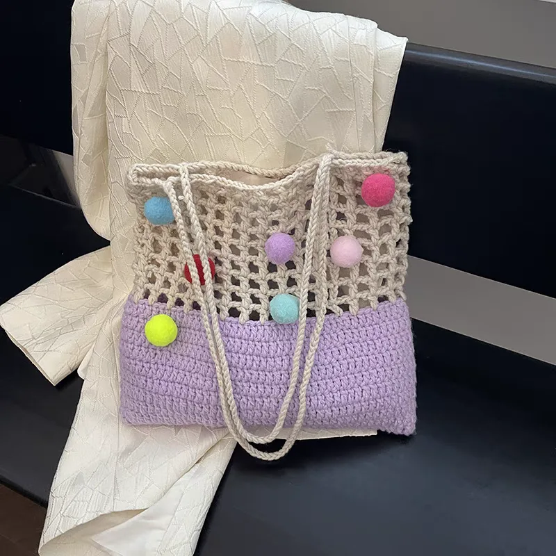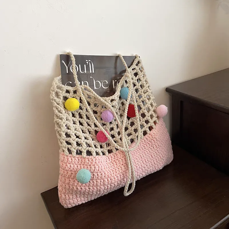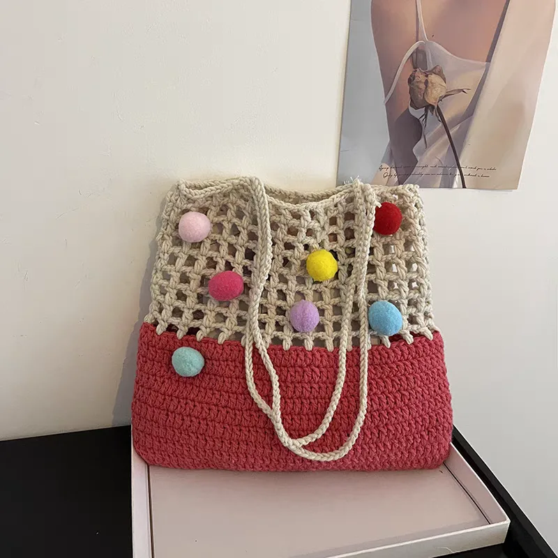 The knitted shoulder bag for women, code 3175, is a large handbag crafted with a combination of two types of knitting and two different colors. The upper part of the bag is knitted in a mesh style with relatively large holes, while the lower part is knitted more densely. For carrying the bag, two narrow woven straps made from the same material as the upper part are provided, hanging from both sides of the bag. A notable decoration of this bag is the colorful woolen tassels of various sizes, scattered across the mesh upper part, giving it a cheerful and whimsical appearance. Overall, with its unique design and colorful tassels, this bag is an attractive choice for casual use and for those who appreciate unique and distinctive styles.