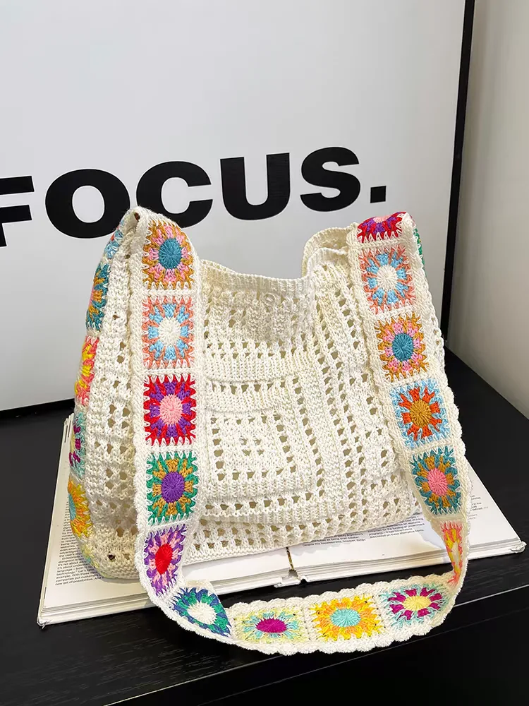 The knitted shoulder bag for women, code 3177, is a large handbag made from thick yarn. The main body of the bag is woven in a mesh style with relatively large holes, giving it a light and summery appearance. It features two relatively wide straps for carrying, which are also knitted and decorated with colorful square patterns in shades of pink, red, green, blue, and orange. These square patterns are repeated along the straps, giving the bag a cheerful and bohemian look. With its mesh design and colorful straps, this handbag is suitable for everyday use or casual outings during the warm seasons.