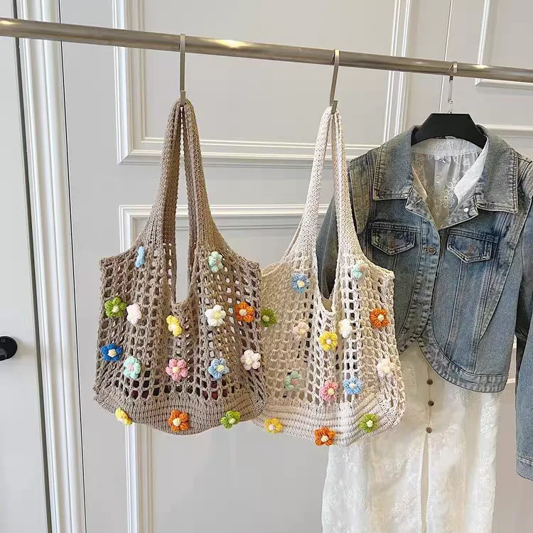 The knitted shoulder bag for women, code 3178, is a large handbag with a simple and spacious design. The upper part of the bag, near the opening and the straps, features a mesh and open weave that forms regular square-shaped holes. This mesh weave transitions into a denser weave at the bottom of the bag. Two straps for carrying the bag on the shoulder are woven from the same material as the body and are seamlessly attached to the bag. These straps are relatively wide and comfortably rest on the shoulder. This bag is suitable for everyday and casual use for carrying more items.