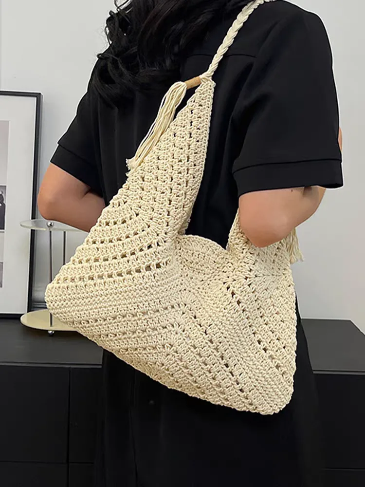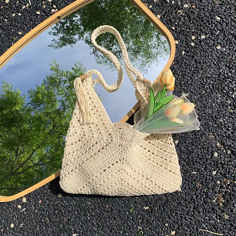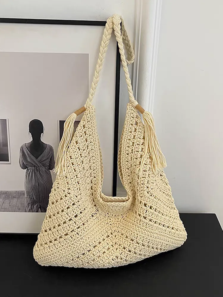 The women’s knitted shoulder bag, code 3180, features a boho and summer design. It is made from thick yarn in a light cream color and has a relatively open and mesh-like texture that conveys a sense of coolness and lightness. The long strap of the bag is made from the same yarn, designed to be thick and rope-like, and is attached to the body of the bag. The large size of this bag allows for the storage of daily essentials. Its unique design makes it an attractive accessory suitable for beach styles, vacations, and everyday outings in the spring and summer seasons.