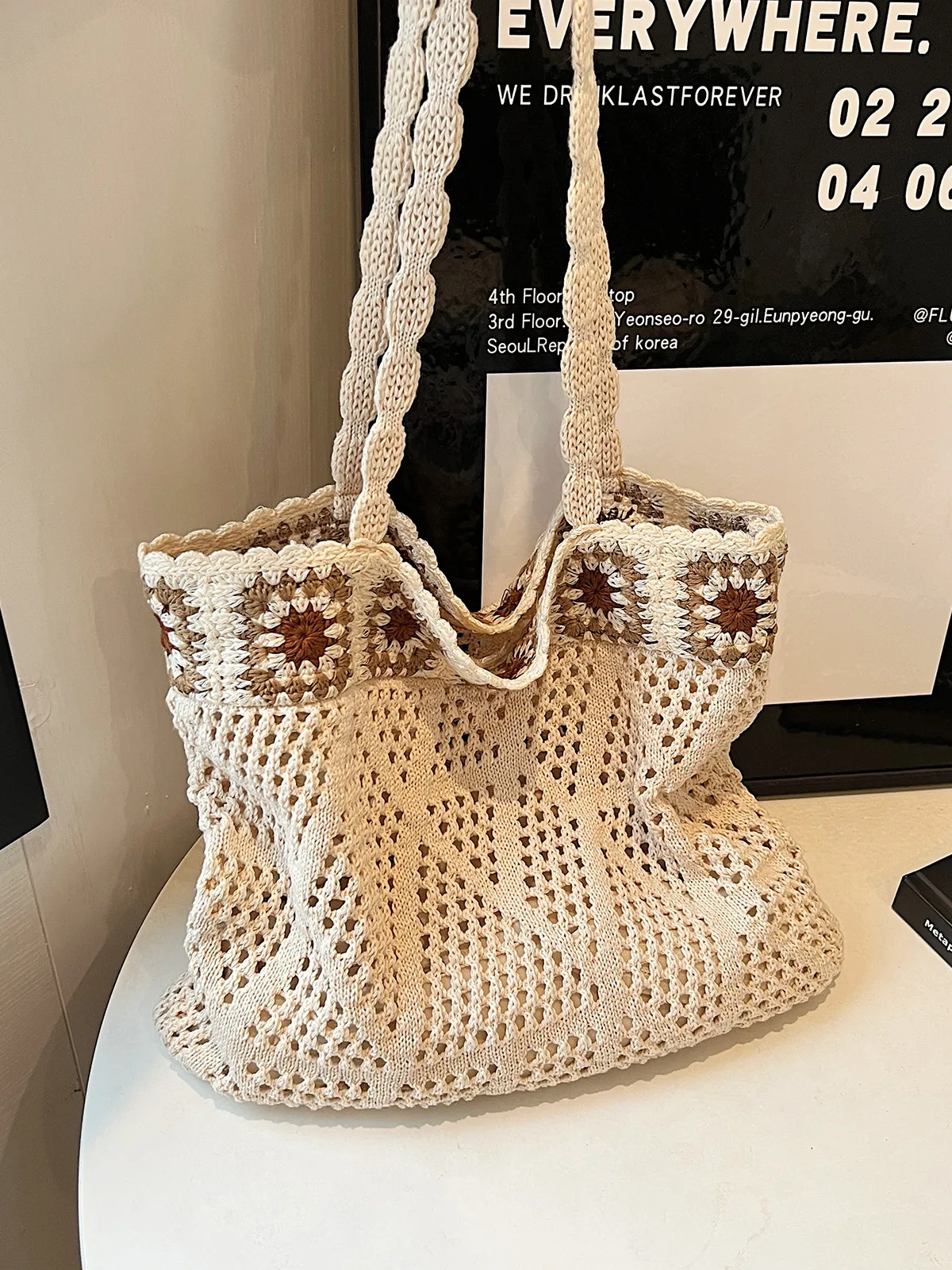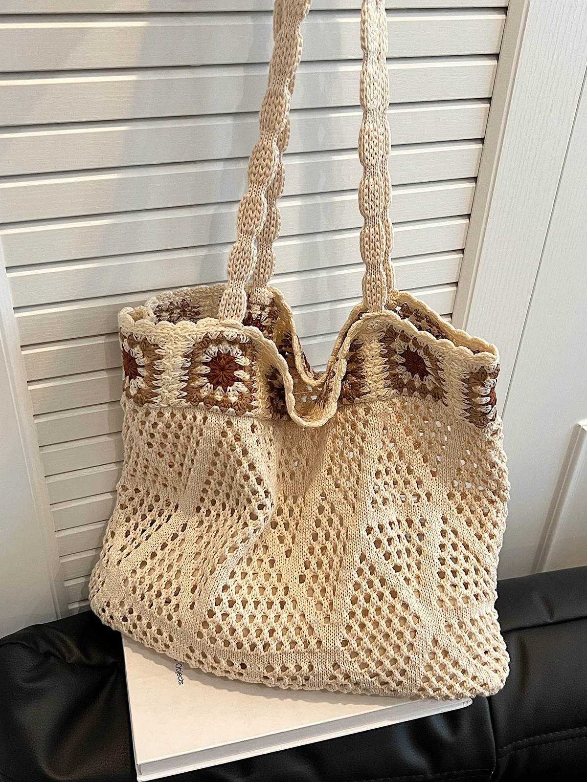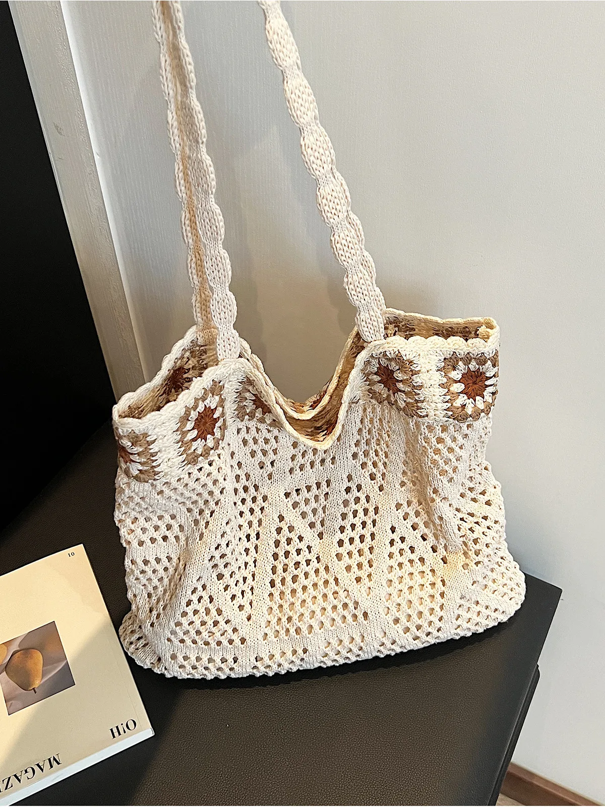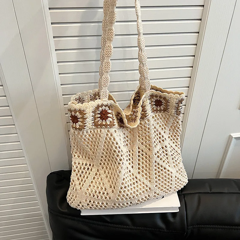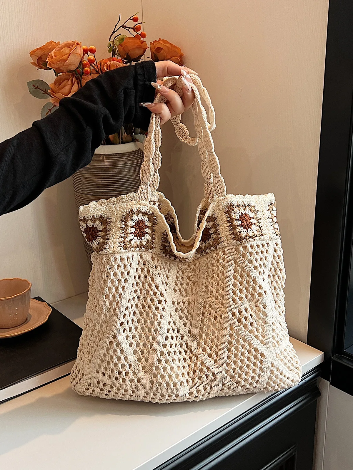 The Macrame Knitted Handbag for Women, Code 3168, is a large and spacious handbag crafted using thick yarn through macrame knitting. The main body of the bag features an open mesh design with loose knots, giving it a light and summery appearance. At the top of the bag, there is a woven border with brown and cream motif patterns that enhance the beauty and durability of the bag’s edges. The handles are also made of macrame, thick and rope-like, seamlessly extending from the bag’s body, allowing it to be carried over the shoulder. The interior of the bag is lined with polyester fabric. Given its material and design, this bag can be a chic and unique choice for everyday use or during vacations.
