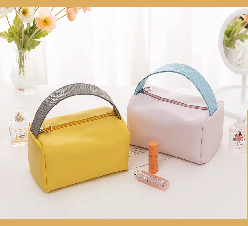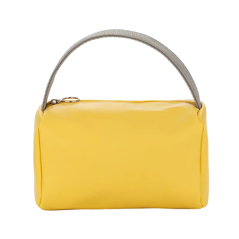 Women’s cosmetic bag code 2964 features a minimalistic and modern design with a cubic and well-shaped appearance. The body of the bag is made from PU synthetic leather with a soft and flexible texture, which also offers high resistance to abrasion and tearing. The short, crescent-shaped handle is made of synthetic leather and is securely attached to the body, allowing for easy carrying by hand or wrist. The bag’s suitable dimensions provide ample space for storing various essential cosmetics such as lipstick, mascara, foundation, brushes, and more.