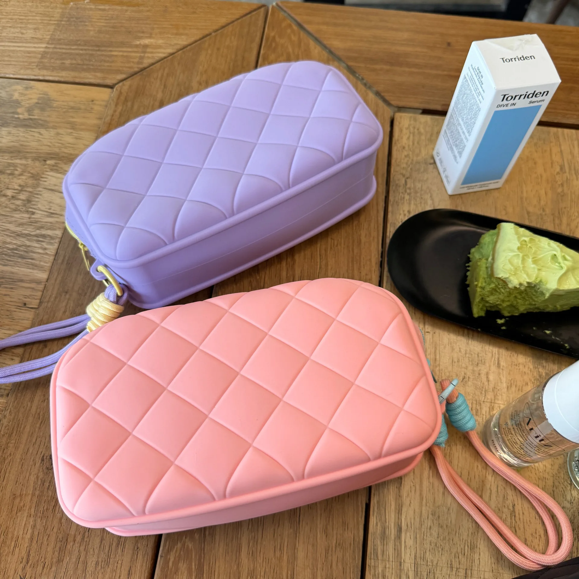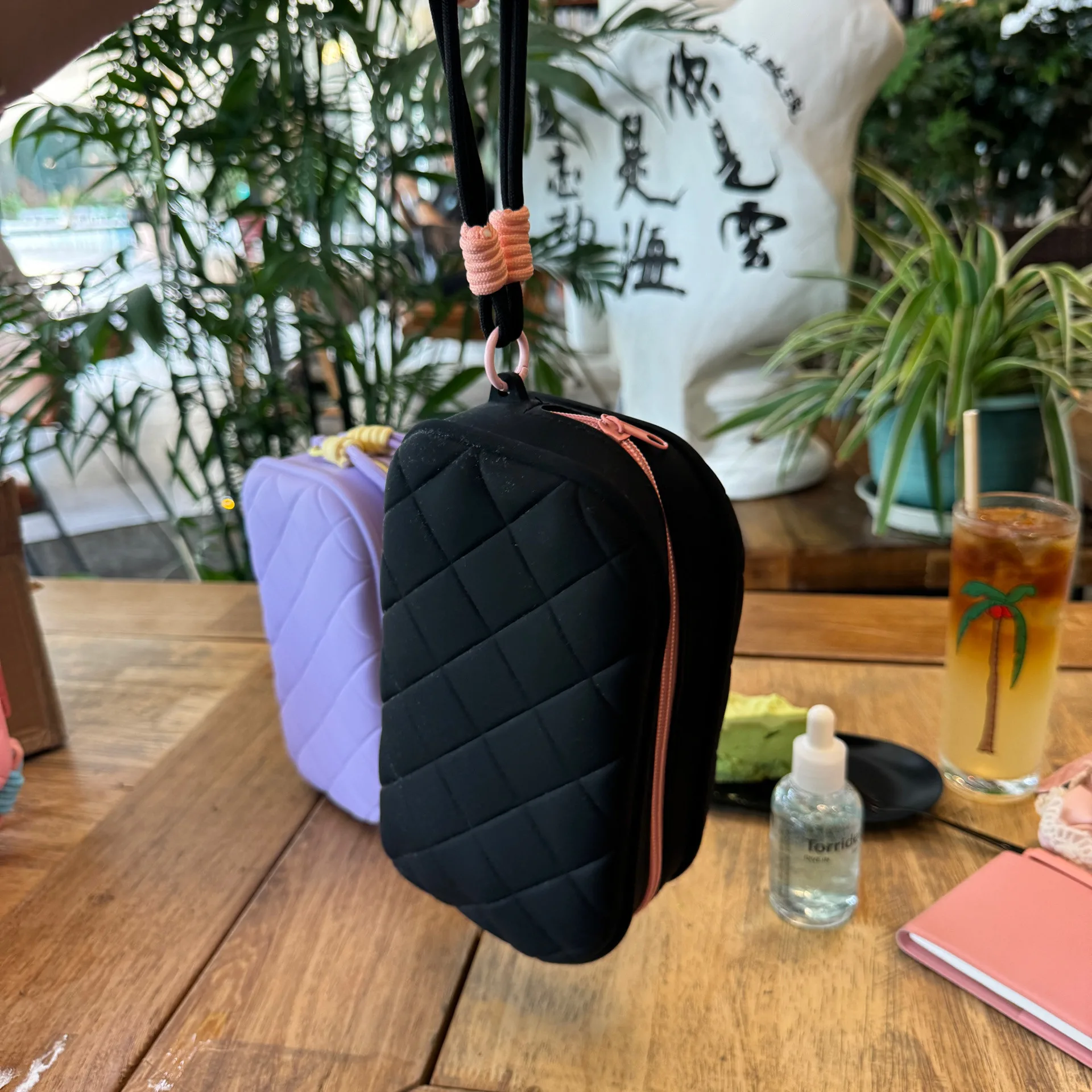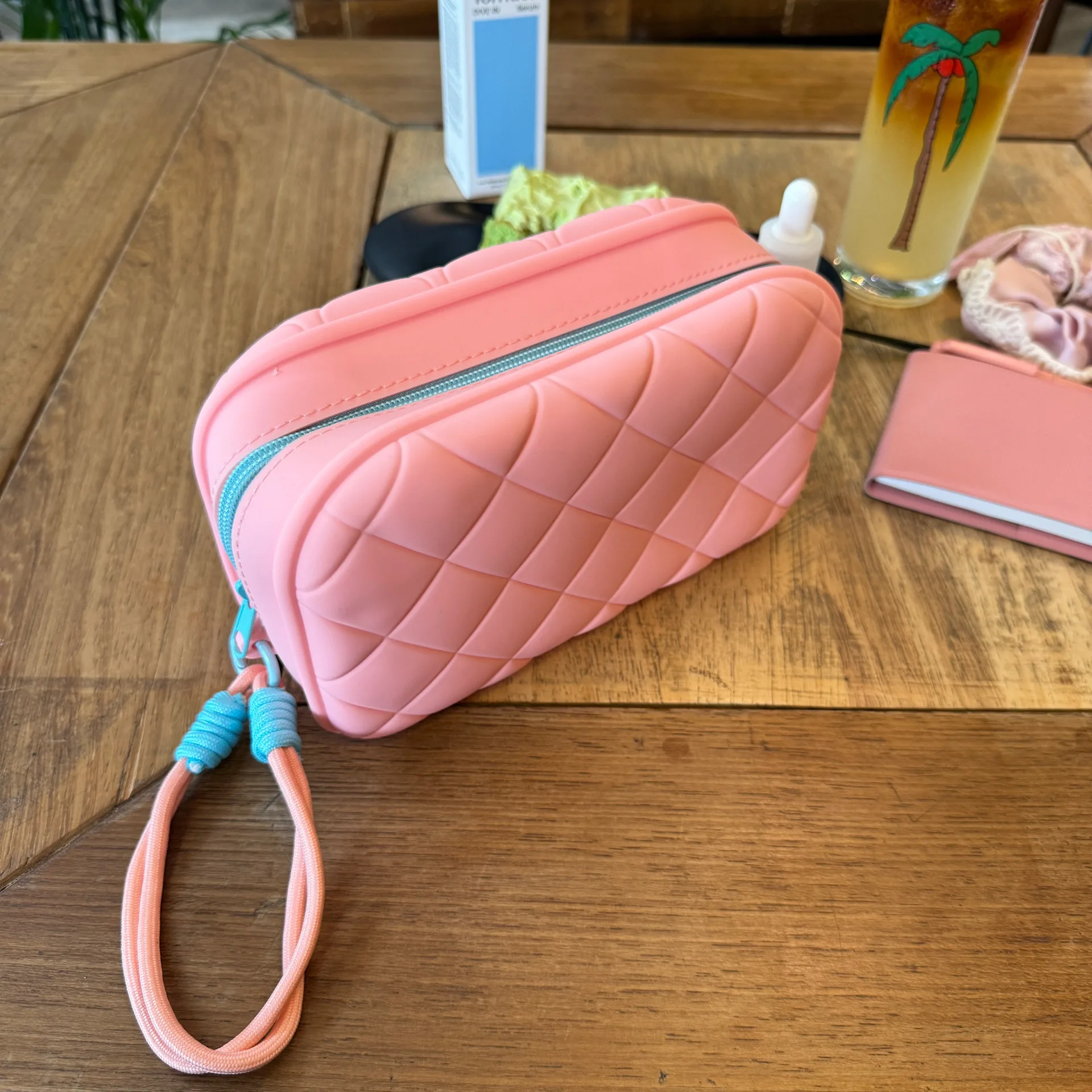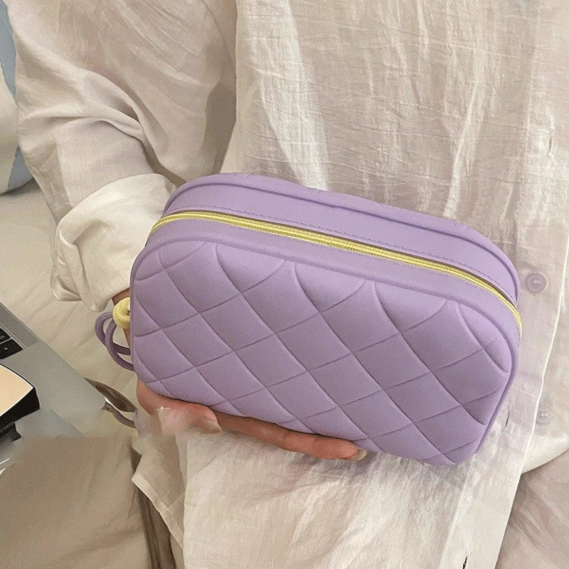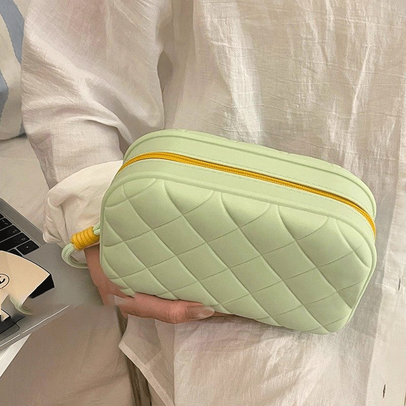 The women’s makeup bag, code 2975, is made from soft and delicate silicone, featuring a diverse range of colors and an embossed diamond pattern, giving it a chic and modern appearance. The short and thin strap of the bag, made from the same silicone material, allows for easy carrying, and its knotted ends enhance its beauty. This silicone bag, due to its durable and waterproof nature, is an ideal choice for storing makeup during travel or for everyday use, and it is easy to wash and clean.