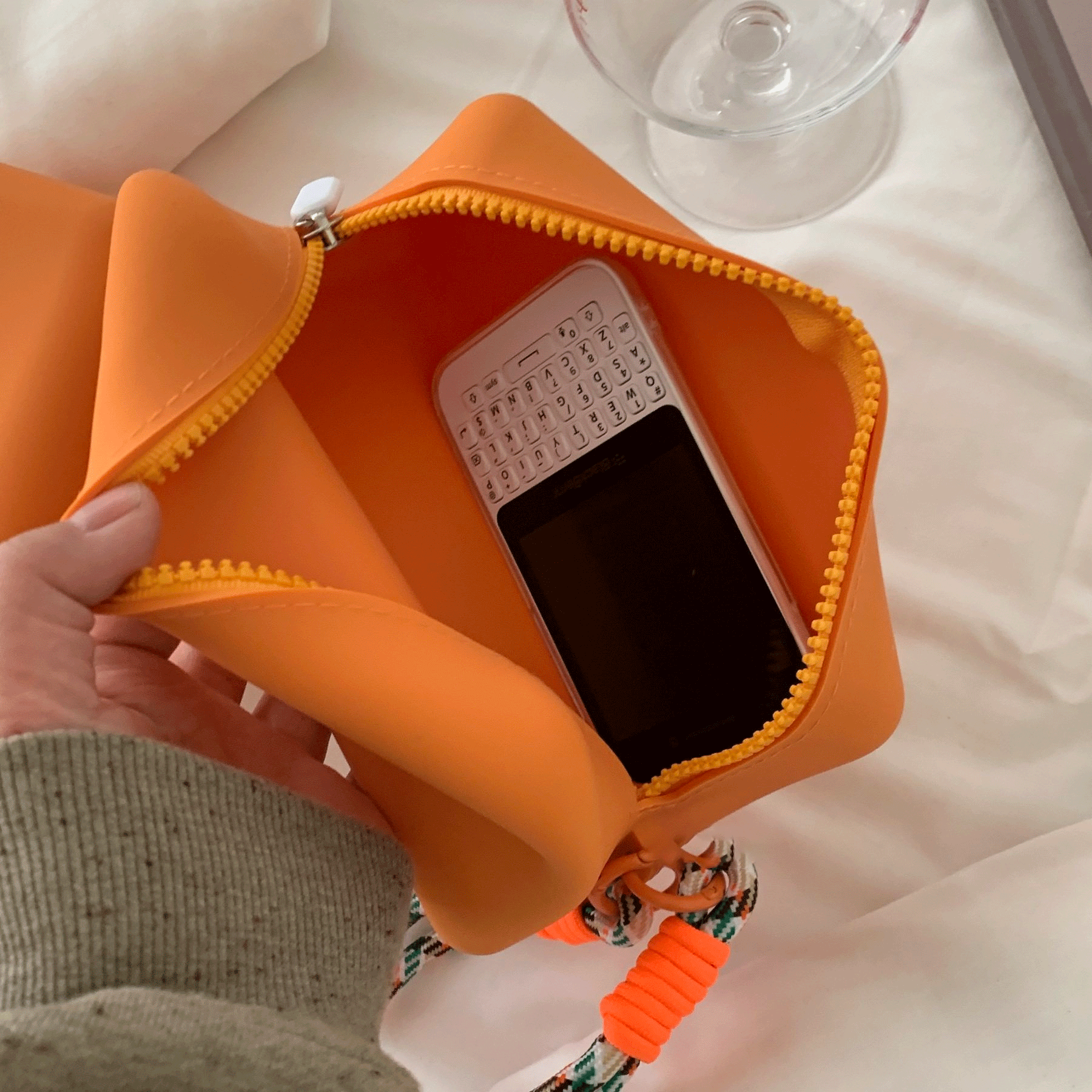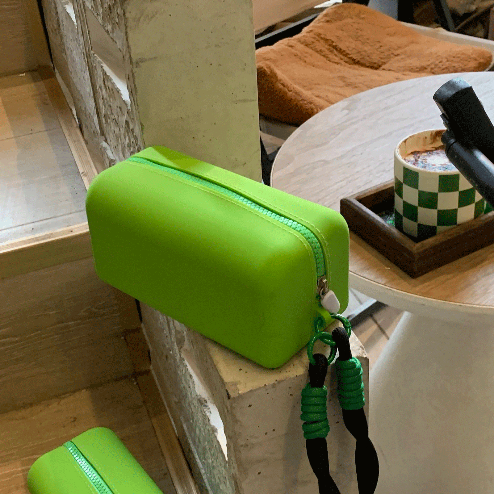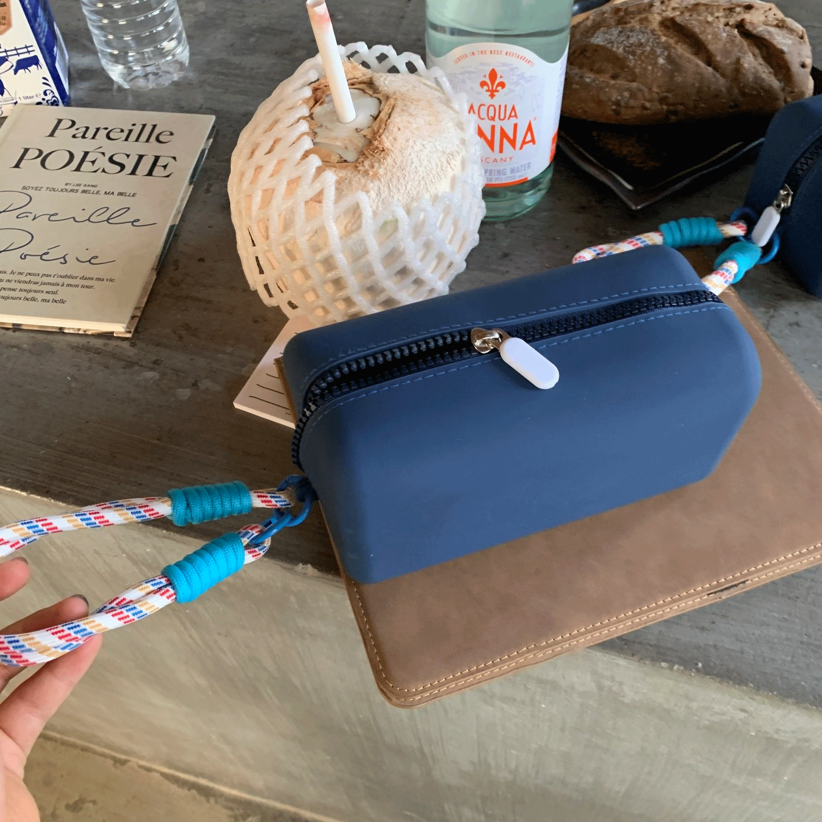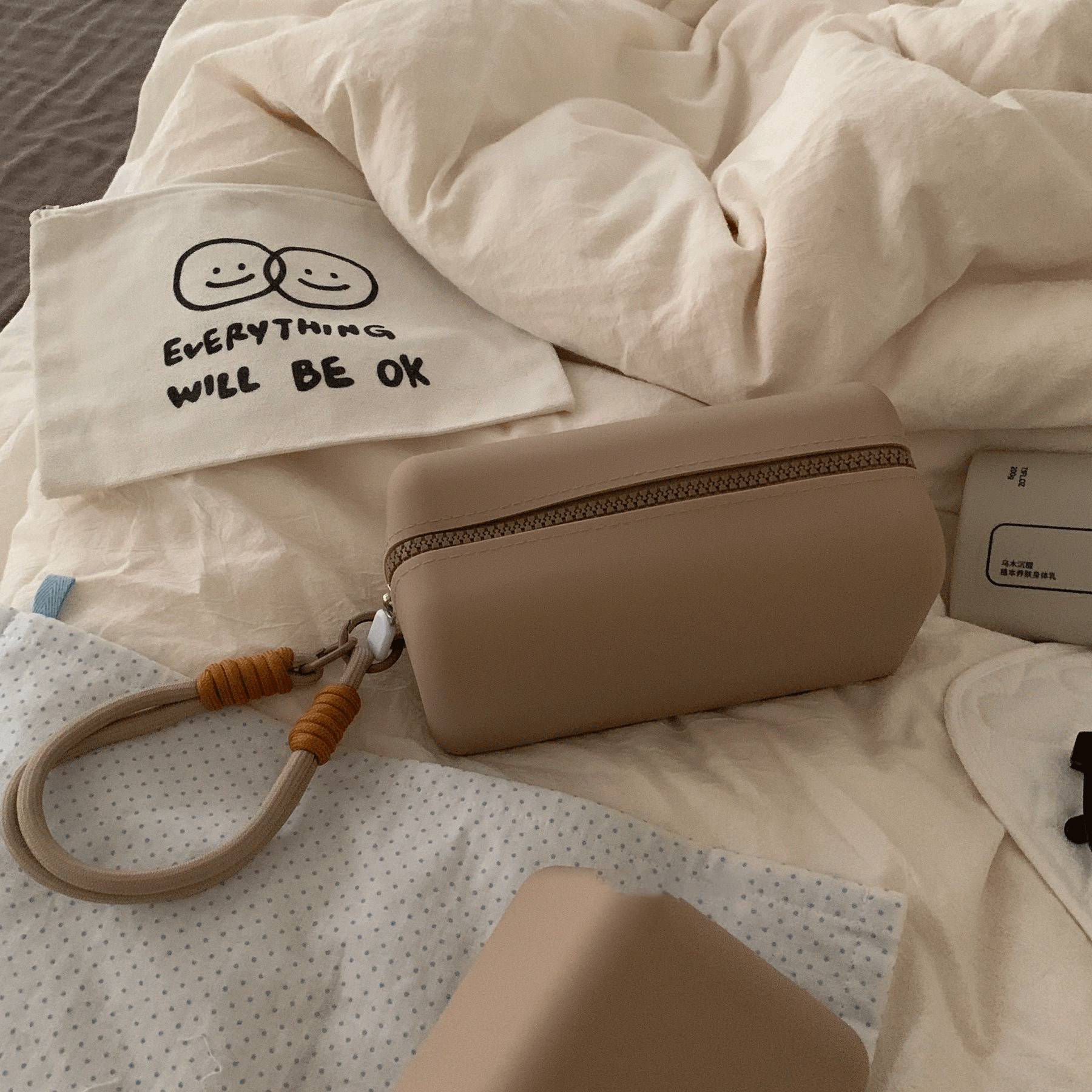 The women’s makeup bag, code 2976, is made from soft and flexible silicone and has a compact, cube-shaped appearance. The silicone material makes the bags waterproof and durable, making them suitable for storing makeup during travel or for everyday use. On the side of each bag, there is a short, woven strap in various colors that allows for easy carrying. The zippers are metallic and silver-colored, making it easy to open and close the bag. With its large and spacious interior, this bag can hold a lot of makeup items, including various foundations, mascaras, and more.