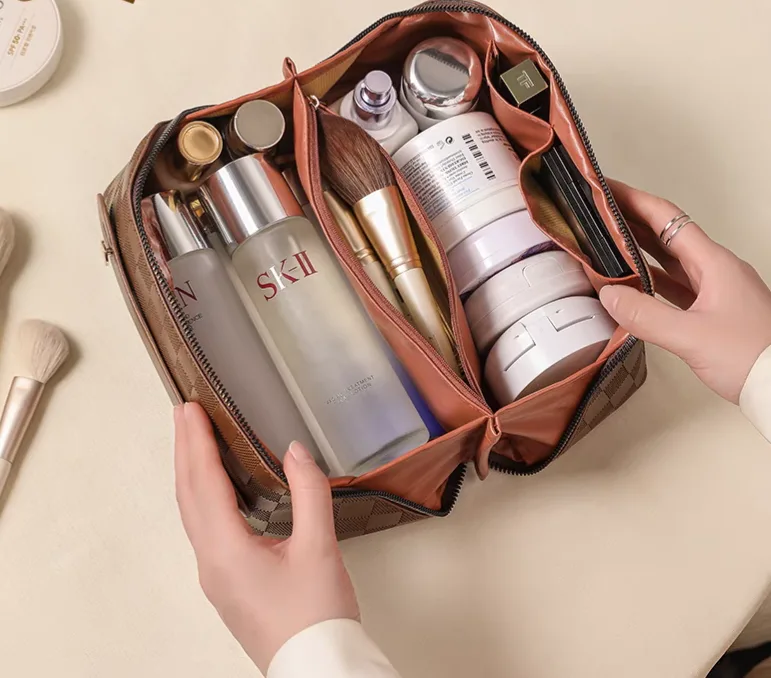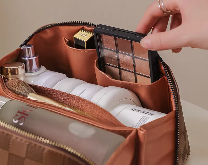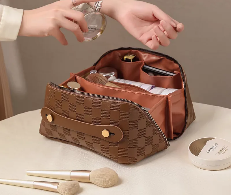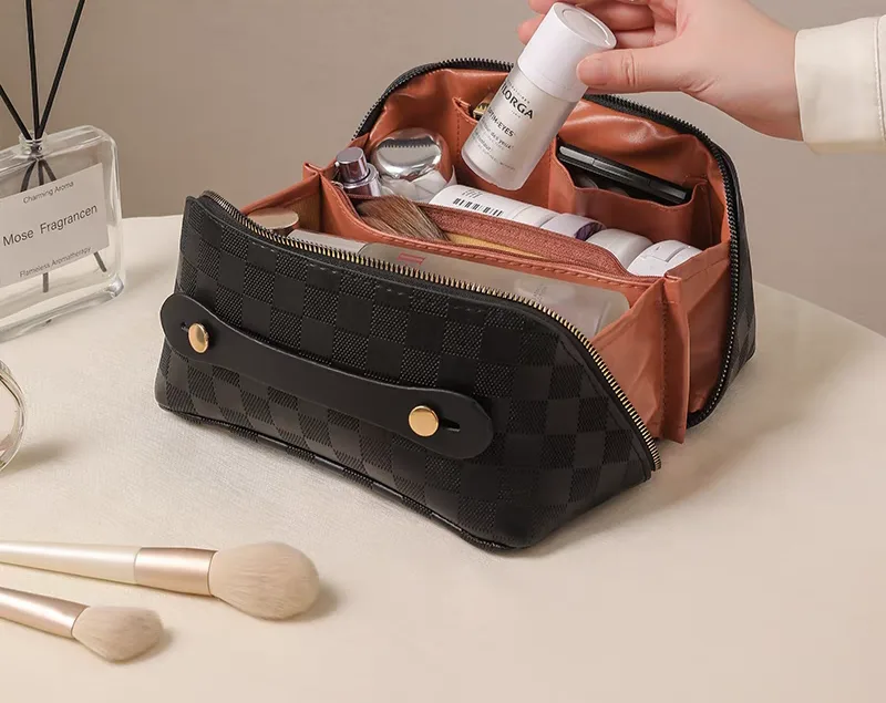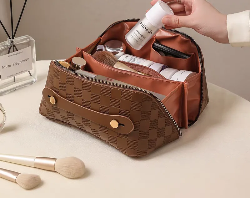 The women’s makeup bag, code 2994, is a rectangular-shaped makeup bag with a large checkered pattern. This bag is made from PU (polyurethane), giving it a stylish and attractive appearance. The interior lining of the bag is made of polyester, which serves as a soft and durable lining to protect the makeup items inside the bag. The bag features a main zipper that, when opened, reveals an interior space with several separate sections for better organization of makeup items. On the front of the bag, there is a narrow PU handle with two gold-colored buttons for easier carrying. Overall, this makeup bag, with its beautiful design, high-quality material, and spacious interior, is an ideal choice for storing and carrying makeup items.