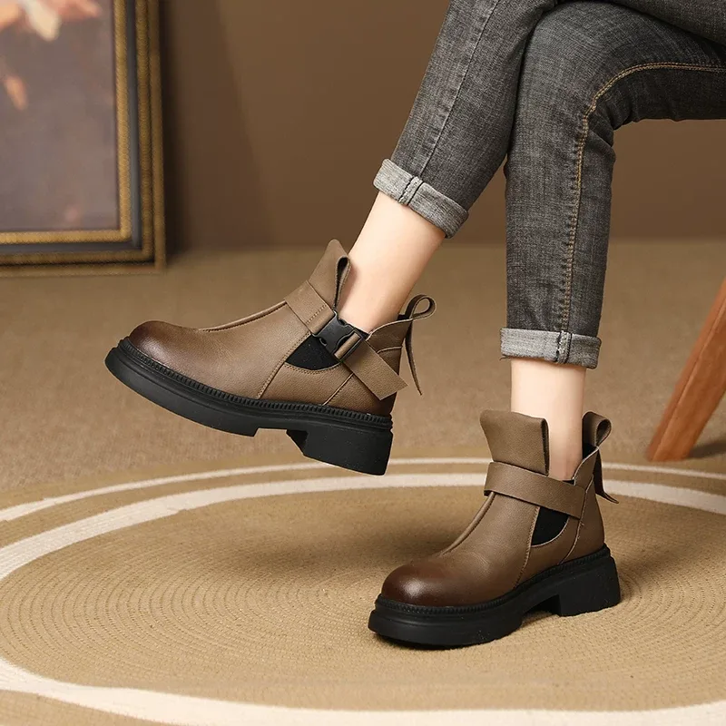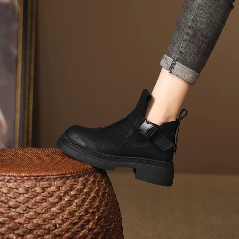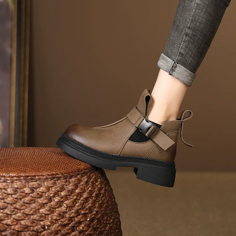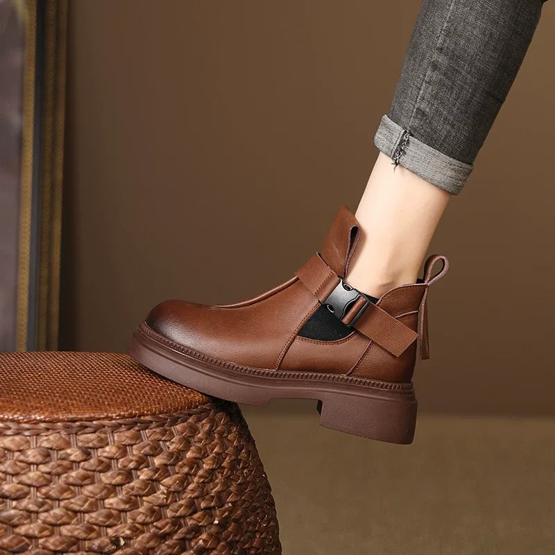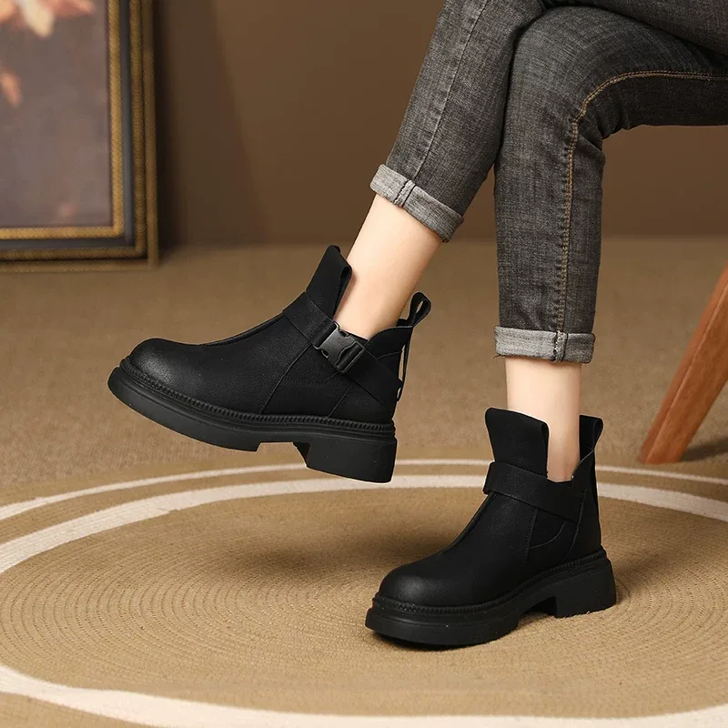 Women’s Natural Leather Ankle Boots, code 2434, with a modern yet classic design, are an ideal choice for various styles. The upper material of the shoes is made of high-quality natural leather, which not only offers a beautiful and luxurious appearance but also provides high durability and resistance, acquiring a unique and distinctive look over time. The velvet lining inside the boots offers additional softness and warmth for the feet. A decorative metal buckle on the outer ankle adds a special and distinctive touch. The thick and uniform sole of the boots not only increases height but also provides more comfort while walking and protects the feet from cold and moisture. The popular color options of these boots allow them to be paired with various outfits, giving a chic and sporty appearance.
