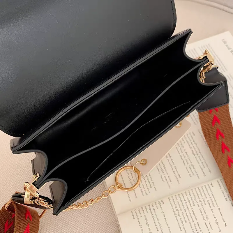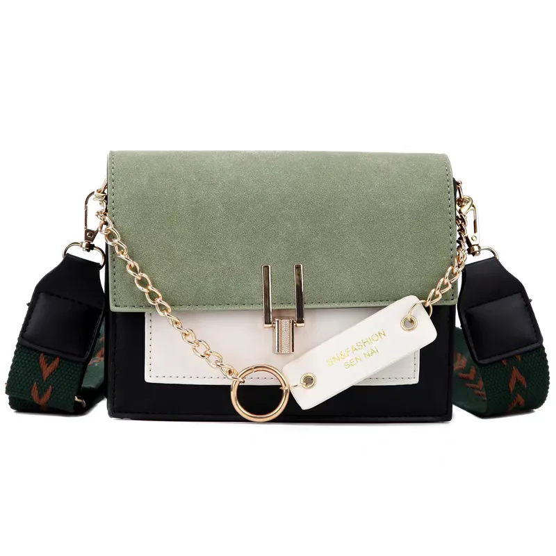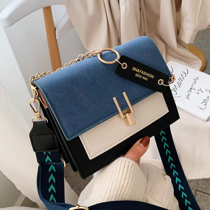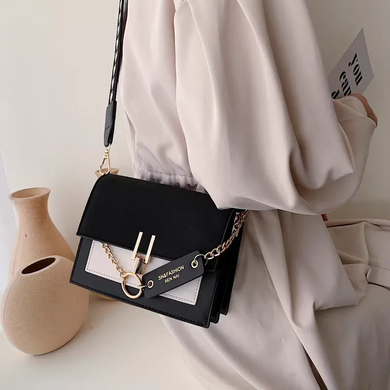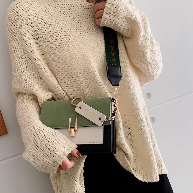 Women’s shoulder bag code 1547, with a minimal design and a combination of white with black, olive green, brown, and blue colors, has a chic and modern appearance. The use of a gold chain and shiny metal lock adds a sense of luxury and formality to the bag, while the wide strap with a woven design is both highly durable and comfortable for everyday use. The size of the bag is perfectly suitable for carrying essential items such as a mobile phone, wallet, and small cosmetics. This bag can be an excellent choice for parties, friendly gatherings, or even everyday style.