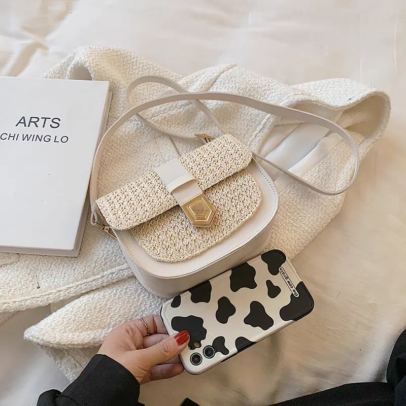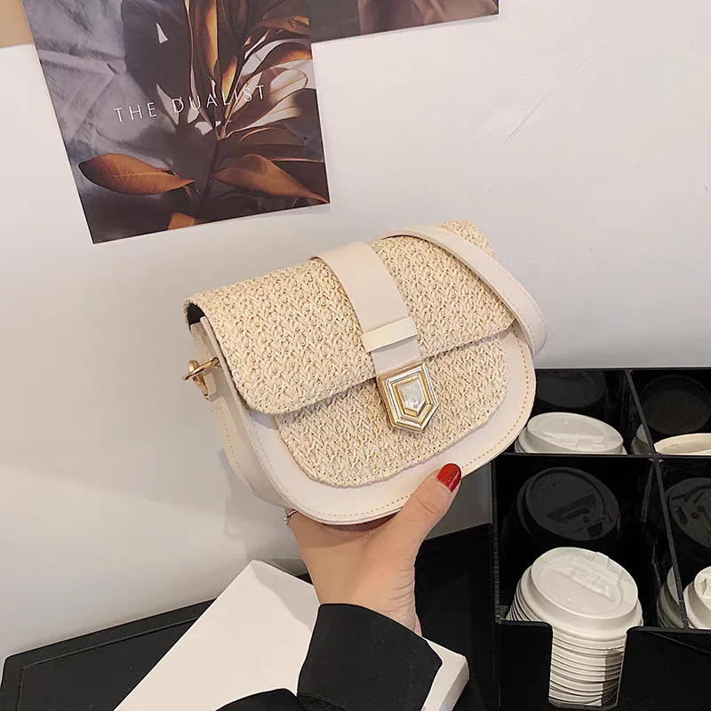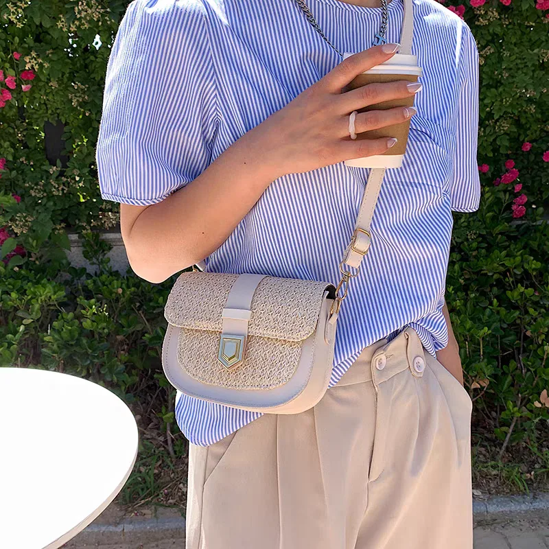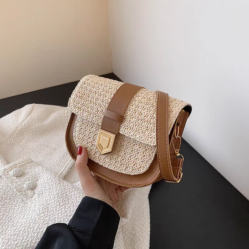 Women’s shoulder bag code 2742, with a combination of woven straw and synthetic leather, brings a sense of summer and travel. The light-colored woven straw evokes sunny days and warm beaches, while the leather edges and strap give it a sturdy structure and modern appearance. The gold-colored metal clasp on the front of the bag serves as its focal point, adding a touch of luxury. This bag, with its unique design and use of high-quality materials, is an ideal choice for those seeking a distinctive and different accessory.