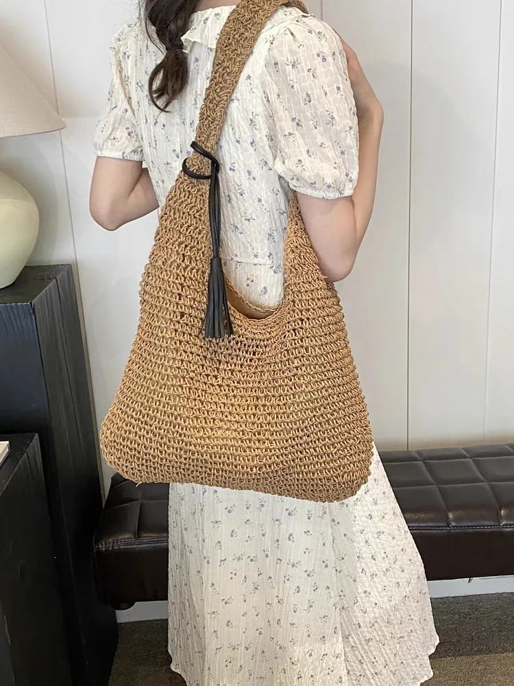 Women’s Straw Shoulder Bag Code 2540 features a shoulder strap and is made from synthetic straw. This model, due to its lightweight and spacious design, can be a suitable option for shopping, outings, or short trips. If you are interested in bohemian styles, long cotton dresses in bright colors, summer sandals, and straw hats are an ideal combination for these types of bags. The nude colors of this bag model easily match with various outfits.